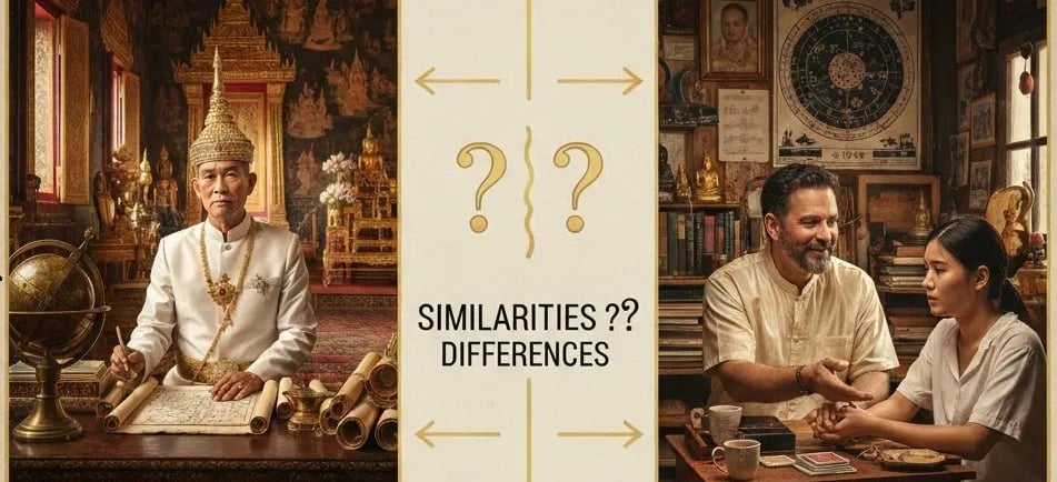 ถ้าพูดถึงคำว่า "โหรหลวง" กับ "โหรไทย" (หรือโหรชาวบ้านทั่วไป) หลายคนอาจจะนึกว่าก็เหมือนกันนั่นแหละ แค่เปลี่ยนที่ทำงานเฉย ๆ หรือเปล่า? จริง ๆ แล้วมีความต่างกันอยู่พอสมควรครับ ฟีลเหมือน "หมอประจำตัวครอบครัว" กับ "รัฐมนตรีว่าการกระทรวงสาธารณสุข" อะไรประมาณนั้นเลย